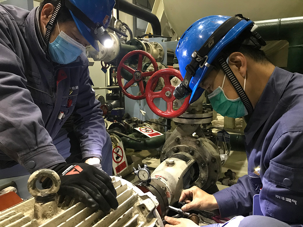 “疫”戰(zhàn)之下,很多工作按下暫停鍵。而京豐的工作卻刻不容緩。生產(chǎn)現(xiàn)場各種管道“叢林”、大大小小的設(shè)備中,忙碌的身影隨處可見。一邊是烤把加熱的呼呼聲,一邊是擰緊螺母的叮咚聲,口罩遮住了他們的面孔,心無旁騖的眼神注視向前,背上有汗,臉上有痕。熱火朝天的檢修工作在嚴(yán)格落實(shí)疫情防控措施的同時(shí),安全有序地進(jìn)行著。