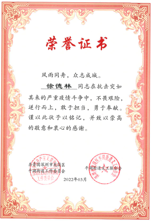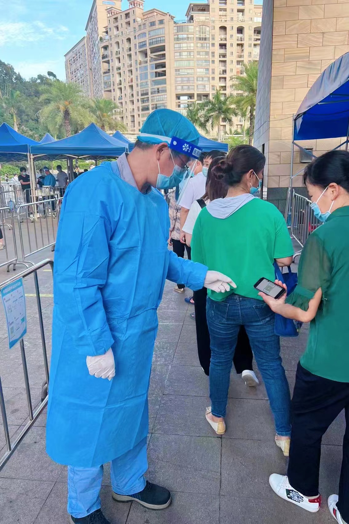 2022年春節(jié)期間,深圳突發(fā)疫情,志愿服務(wù)人手緊缺,他主動找到社區(qū)負責(zé)人,報名參加疫情防控志愿服務(wù)工作。在春節(jié)后的返城返校及3月份深圳疫情大規(guī)模核酸檢測中,工作量都不小,他每天提前到達核酸檢測點做好準(zhǔn)備工作,在候檢區(qū)域核查身份證和行程碼信息,維護現(xiàn)場秩序,指引大家有序參加檢測。