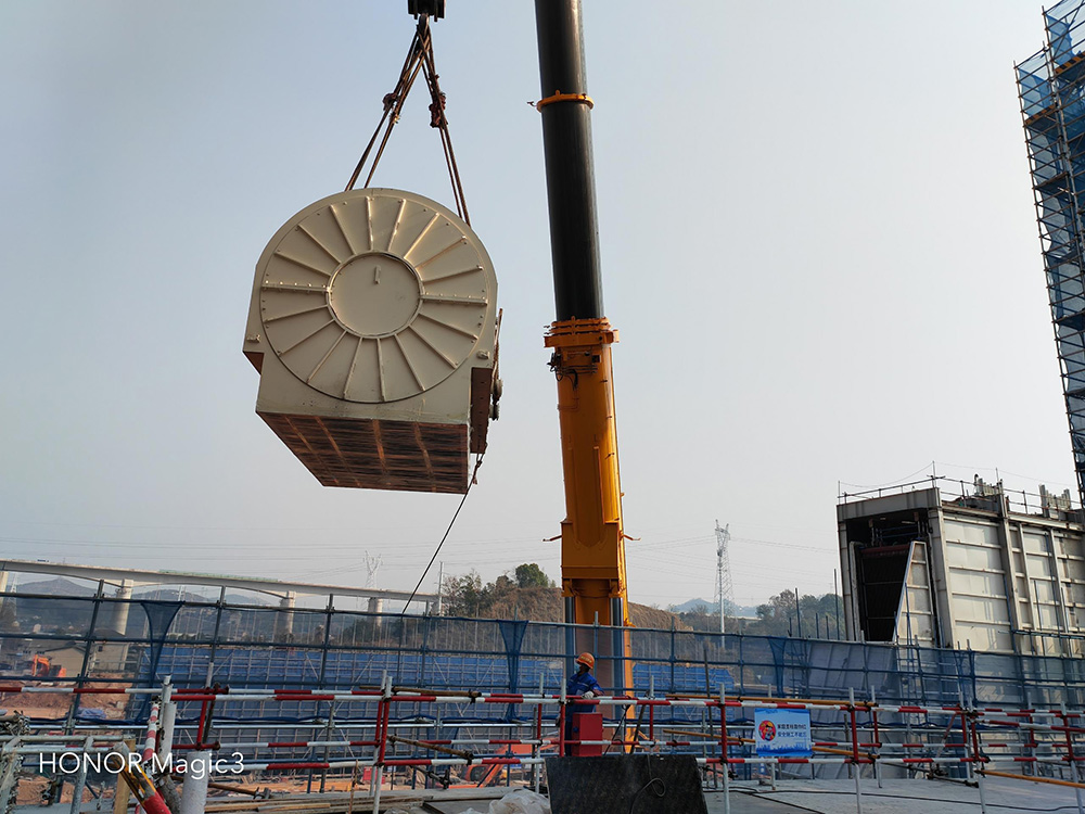 吊裝過程中,各工程技術人員、安全監(jiān)督人員全程監(jiān)護,作業(yè)人員嚴格執(zhí)行吊裝方案的工藝流程、施工方法及安全技術措施,經(jīng)過各方的共同努力下,定子順利放置在發(fā)電機基礎上部,穩(wěn)穩(wěn)就位,整個過程指揮有力,操作精準,安全有序。