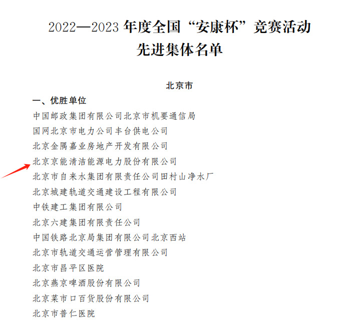 近日,中華全國(guó)總工會(huì)、應(yīng)急管理部、國(guó)家衛(wèi)健委聯(lián)合印發(fā)《關(guān)于表彰2022—2023年度全國(guó)“安康杯”競(jìng)賽先進(jìn)集體和優(yōu)秀個(gè)人的決定》,京能清潔能源公司榮獲2022—2023年度全國(guó)“安康杯”競(jìng)賽優(yōu)勝單位稱號(hào)。