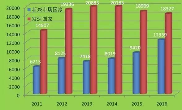 圖4 2011-2016 “500強”企業(yè)中新興市場國家與發(fā)達國家企業(yè)總營業(yè)收入(億元)