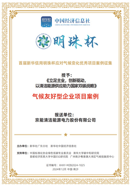 近日,京能清潔能源榮獲首屆“新華信用明珠杯應(yīng)對(duì)氣候變化優(yōu)秀項(xiàng)目”殊榮,佳績(jī)頻傳。本公司始終秉承“綠色發(fā)展、循環(huán)發(fā)展、低碳發(fā)展”的理念,致力于通過(guò)擴(kuò)大清潔能源建設(shè)和模式創(chuàng)新,推動(dòng)能源結(jié)構(gòu)的優(yōu)化升級(jí),為實(shí)現(xiàn)國(guó)家“雙碳”目標(biāo)貢獻(xiàn)力量。