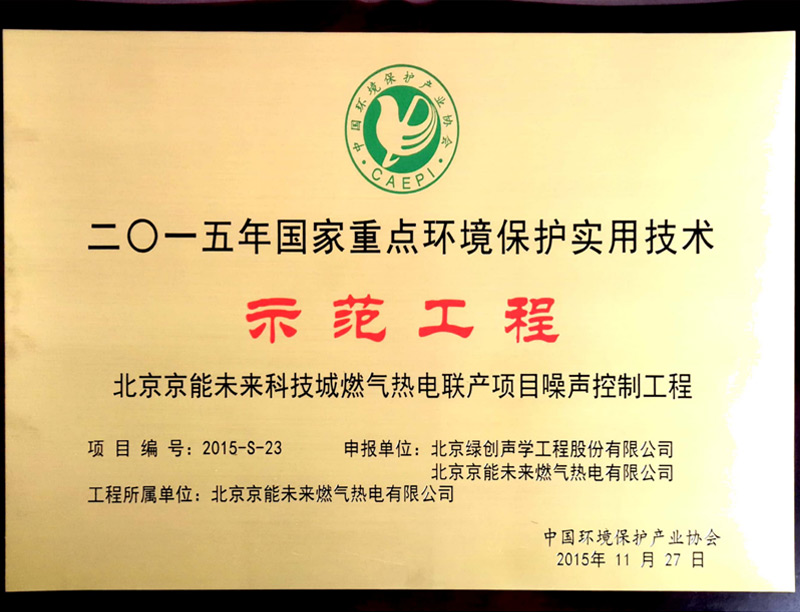2015年11月,北京京能未來燃氣熱電有限公司,北京京能未來科技城燃氣熱電聯(lián)產(chǎn)項目噪聲控制工程榮獲“2015年國家重點環(huán)境保護實用技術示范工程獎牌”
