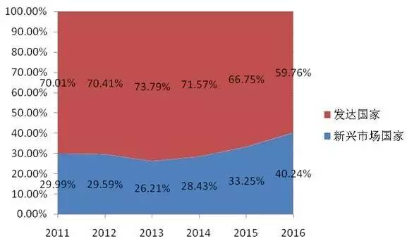圖5 2011-2016 “500強”企業(yè)中新興市場國家與發(fā)達國家企業(yè)總營業(yè)收入占比