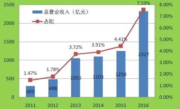 圖8 2011-2016 全球新能源企業(yè)500強中國企業(yè)總營業(yè)收入(億元)